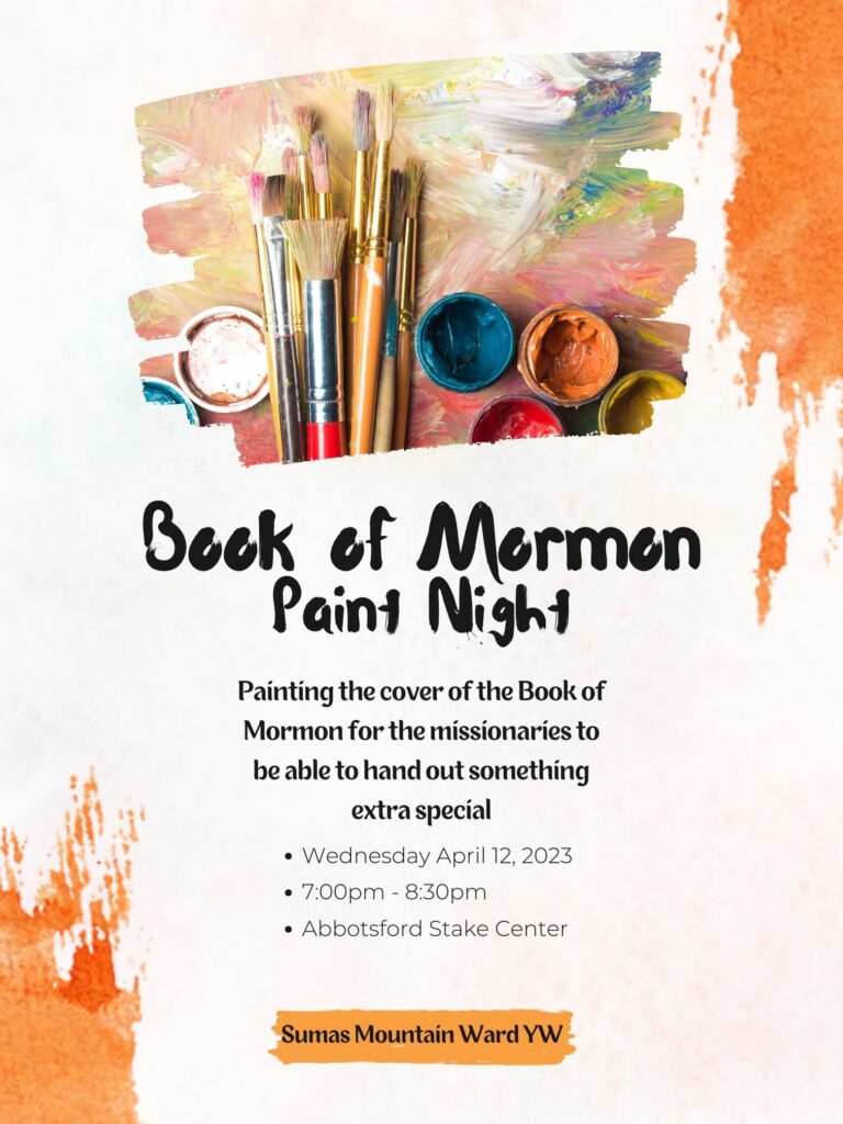 We will be painting the cover of the Book of Mormon to add a special touch to the books that the Missionaries will be handing out. There will be supplies provided, but if you have any paint or paint brushes that you would like to use, please feel free to bring them!