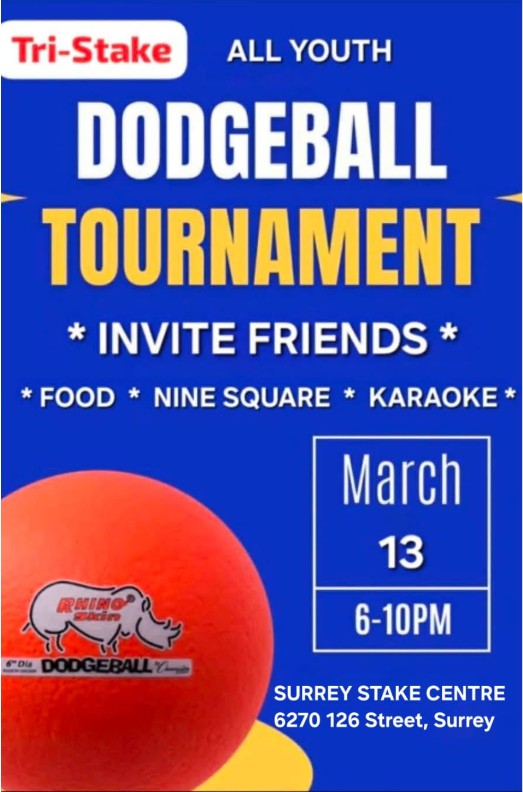 March 13th: Tri-Stake All Youth Dodgeball Tournament, 6-10pm at Surrey Stake Centre