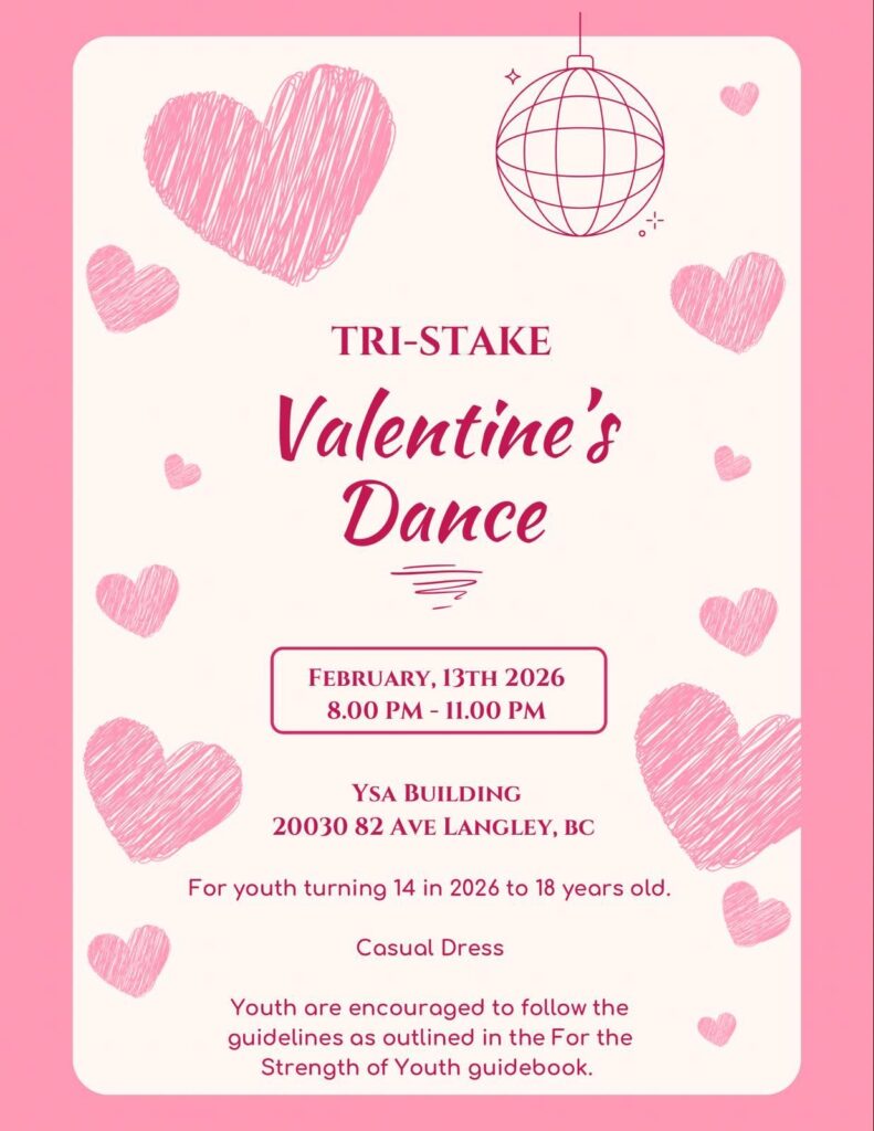 February 13th: Tri-Stake Youth Dance 8:00 PM-11:00 PM at Langley YSA building.